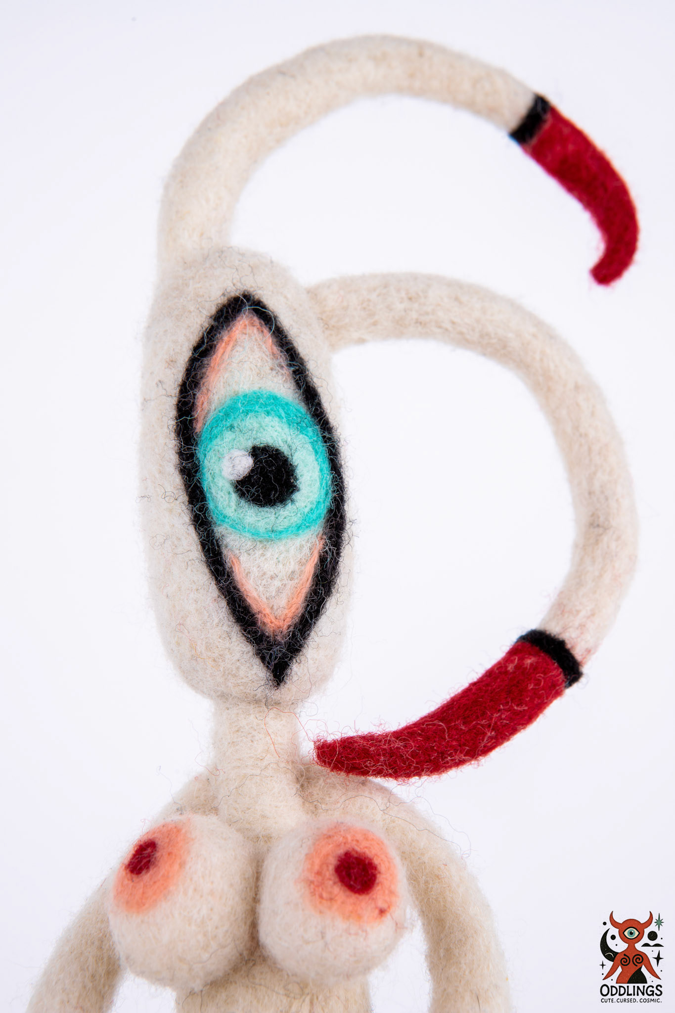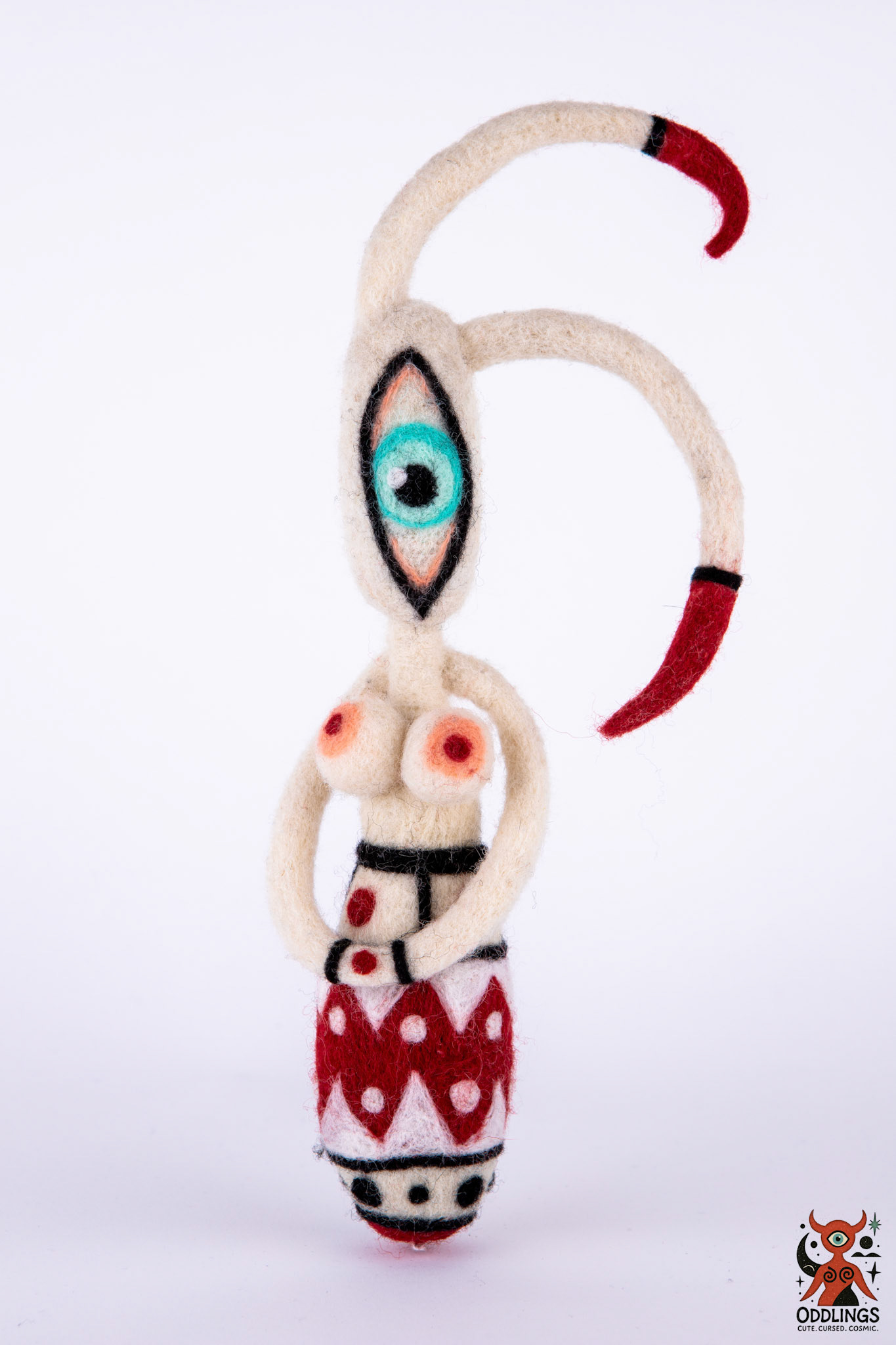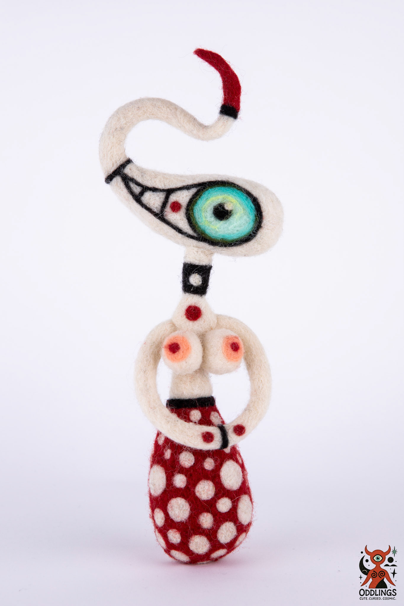 Oddlings are hand-felted dolls born from the blurred edges of fairy tales, fever dreams, and forgotten myths. Each one is a one-of-a-kind familiar — stitched with horns, spirals, breasts, eyes, and the occasional unexplainable detail.
