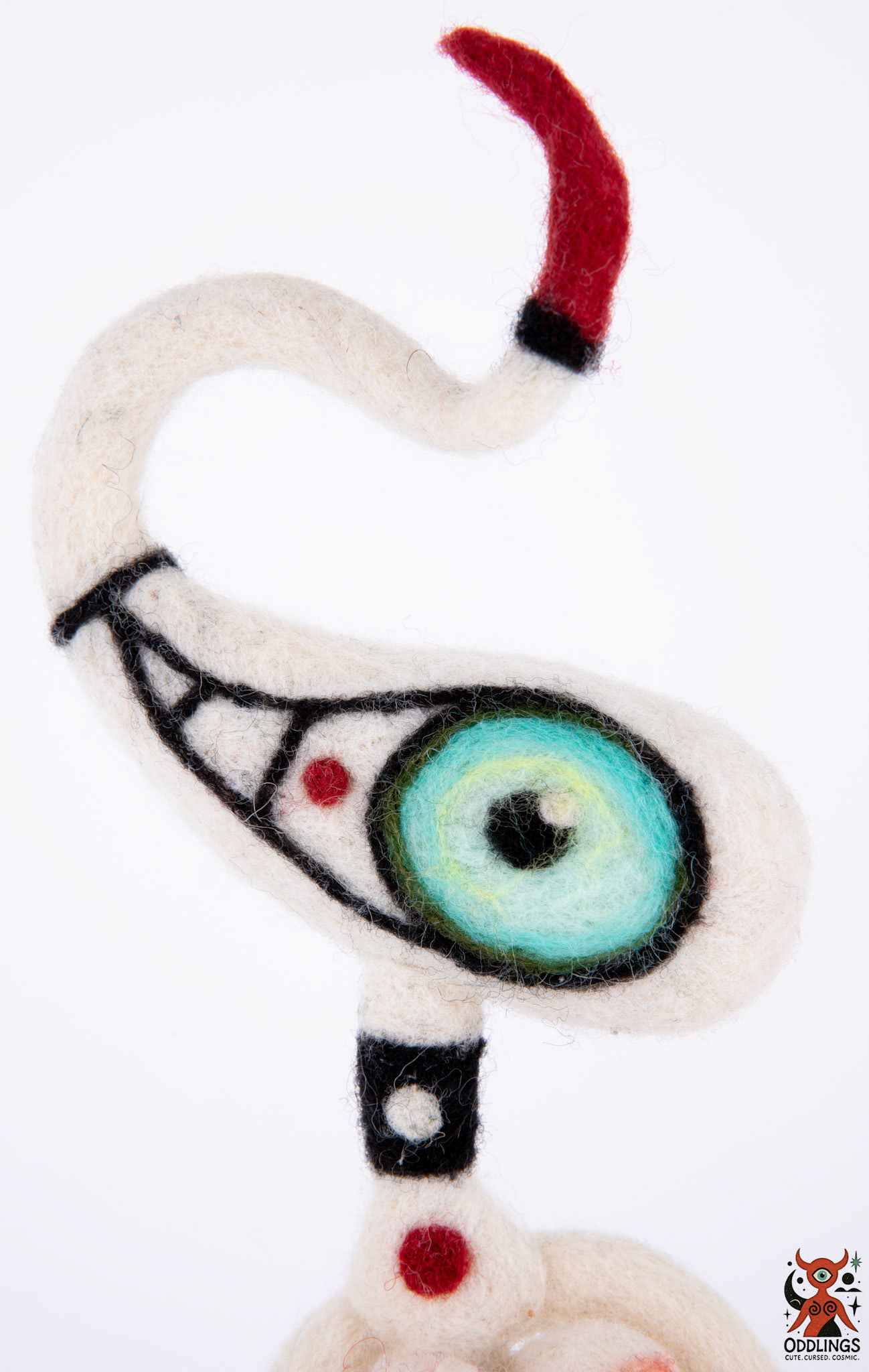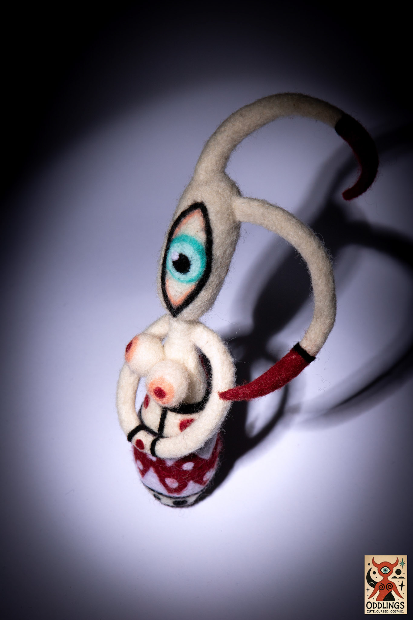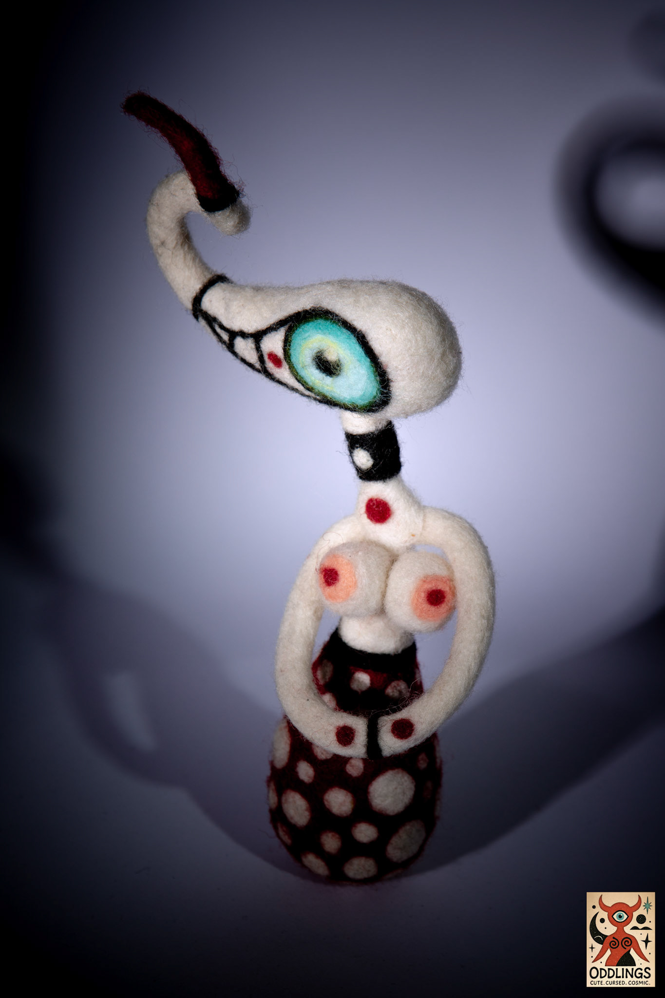 She’s a hand-felted, one-of-a-kind soft sculpture — part oracle, part clown, part optical parasite.